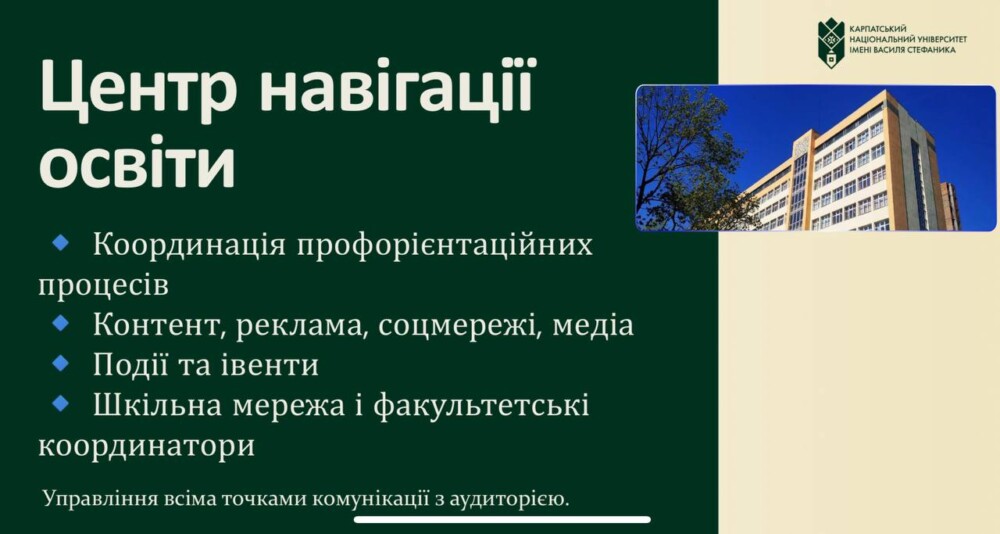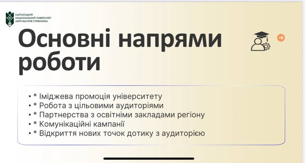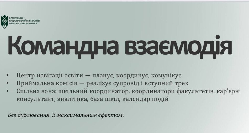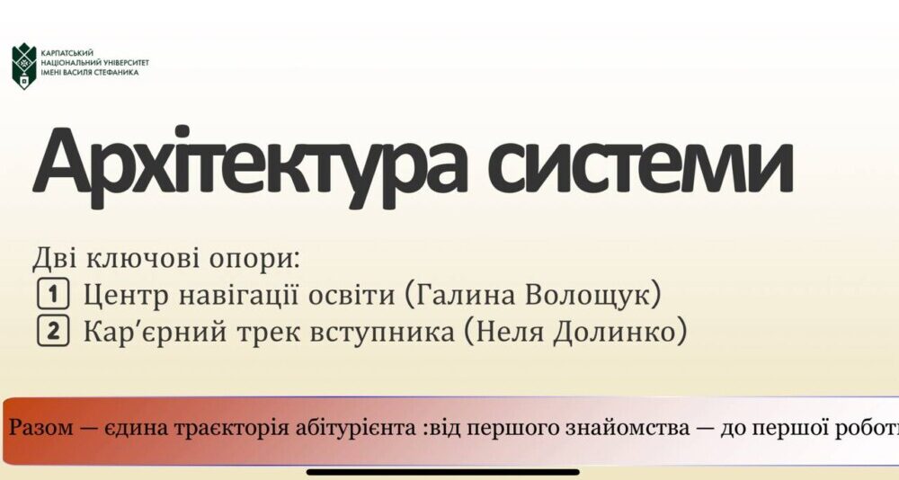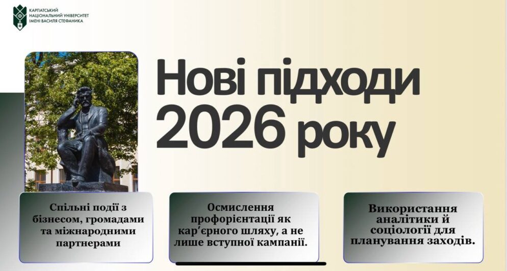 «Сьогодні ми представляємо план профорієнтаційної роботи Карпатського університету імені Василя Стефаника на 2026 рік. Це не просто набір заходів, а цілісна стратегічна система, що поєднує аналітику, комунікації, кар’єрне консультування і взаємодію зі школами. Хочу відзначити, що концепція цієї стратегії була розроблена та запропонована членкинею Наглядової ради університету Яною Стадільною, яка є авторкою ідеї побудови сучасної системи профорієнтації», — наголосила Галина Волощук, додавши, що система має працювати як єдиний злагоджений механізм, у якому кожна людина розуміє свою ділянку роботи, свою взаємодію з іншими, свої конкретні задачі й цілі.